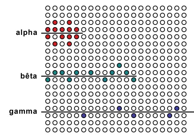 Parcours des rayonnements ionisants : Les particules chargées (alpha, bêta) ont des trajets assez courts dans la matière. Par contre, les photons, grains d’énergie sans masse et sans charge ont des trajets beaucoup plus longs car ils n’intéragissent que de loin en loin avec la matière.